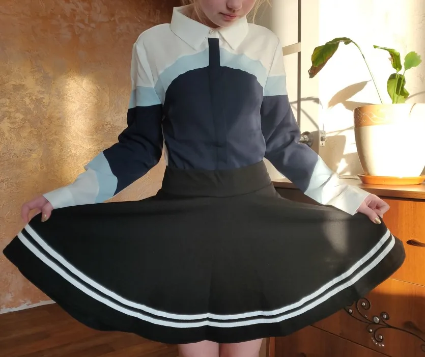 Cool, ordered XL for her daughter for height 152, thin, she is not short, it’s good, at the waist is wide, the daughter is happy. I liked that the skirt is not light, it will not develop from the wind, there is no odor, it came in one parcel with a blouse, very convenient, thank you