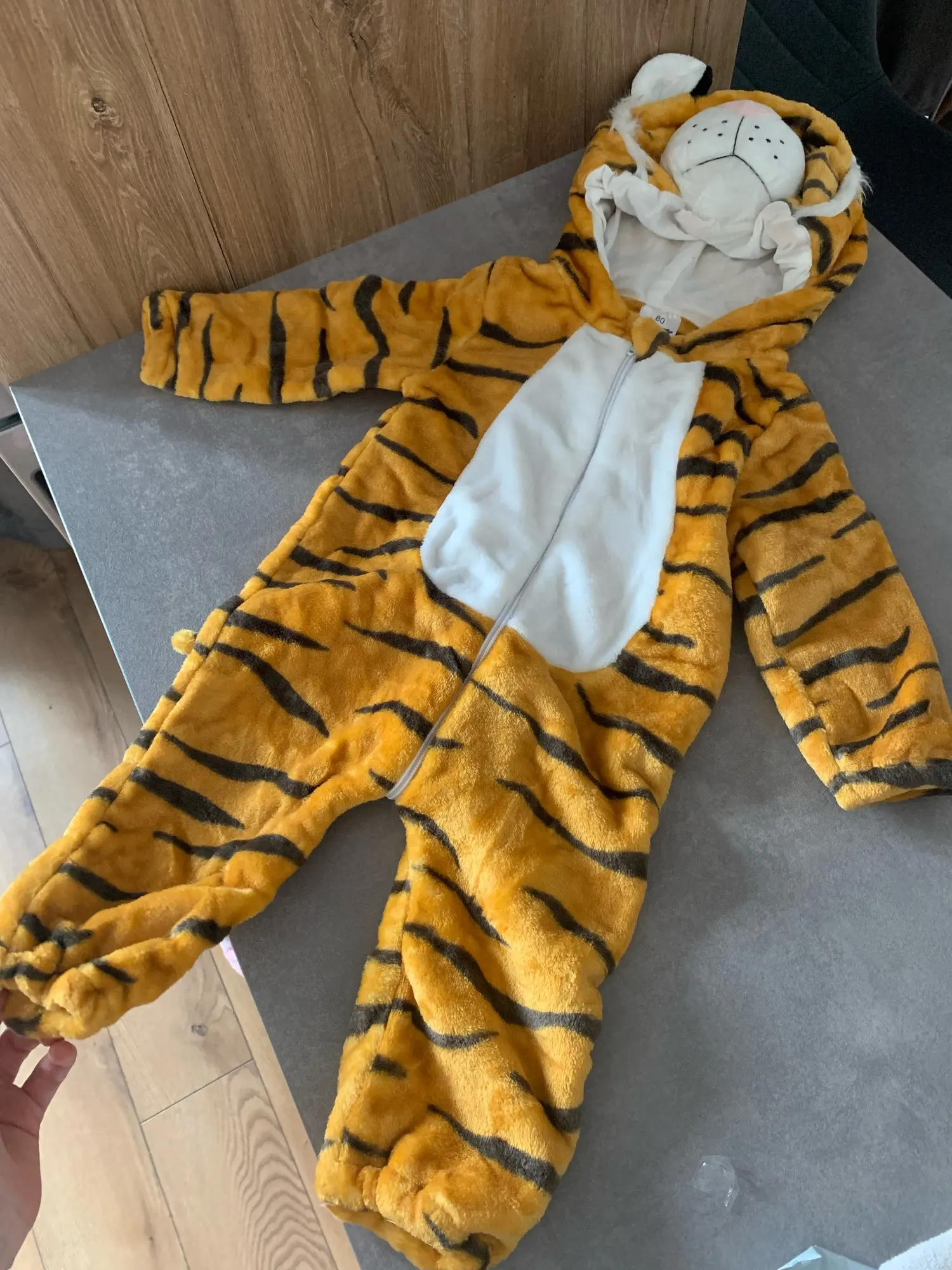 Nice jumpsuit. Soft, warm, pleasant. Very convenient, the zipper passes between the legs.