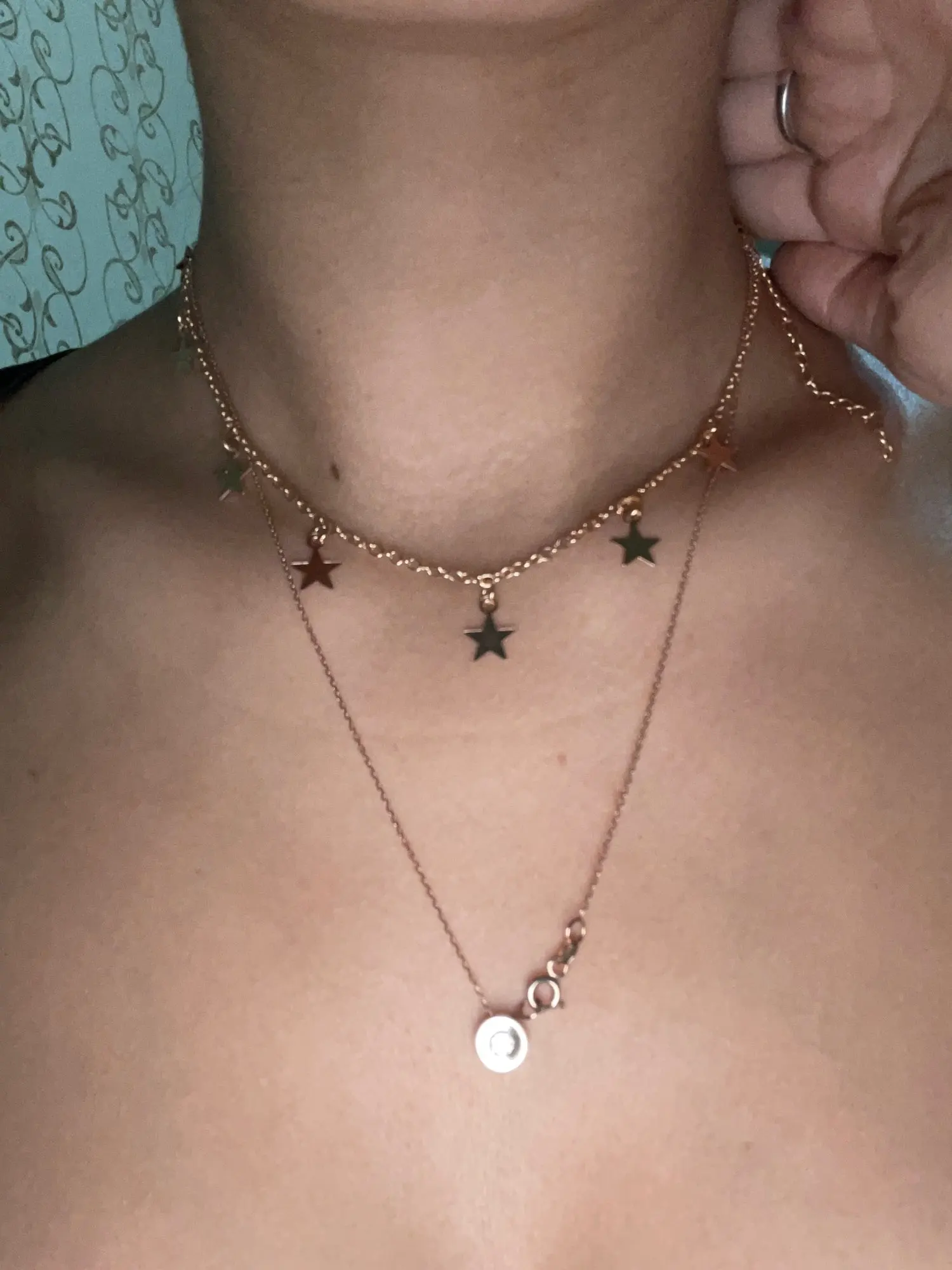 Cheap metal, the type that discolour easily. Chain is not strong either but stays beautifully on the neck