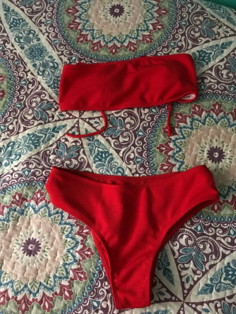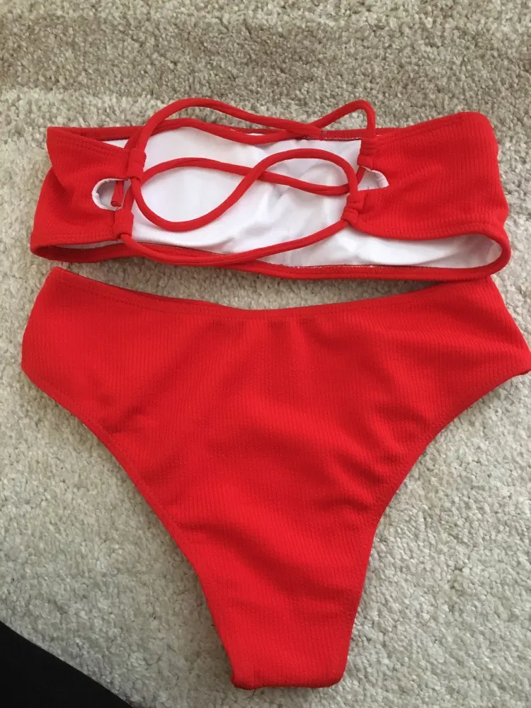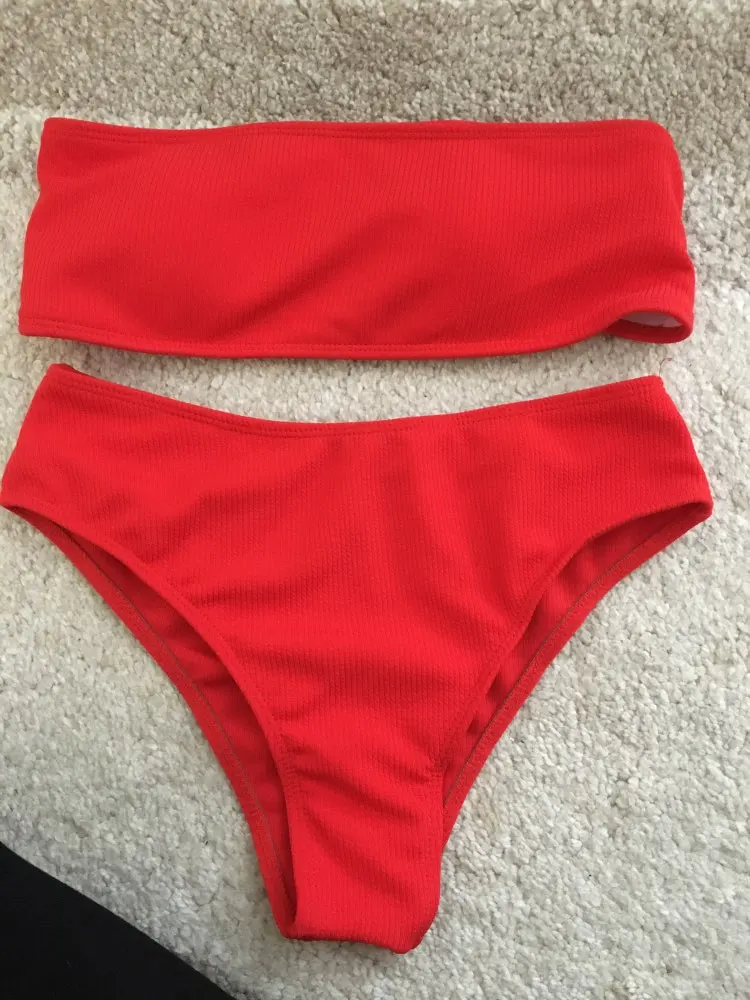 Storlekstabell för bikini med hög midja i röd, gul, rosa och svart färg.
