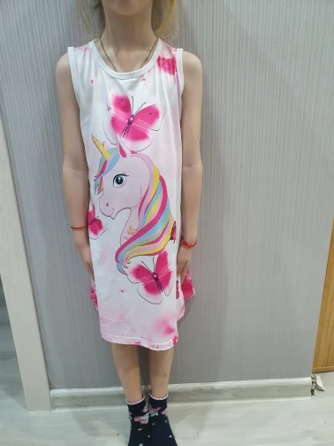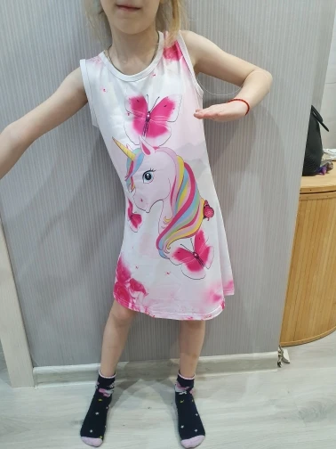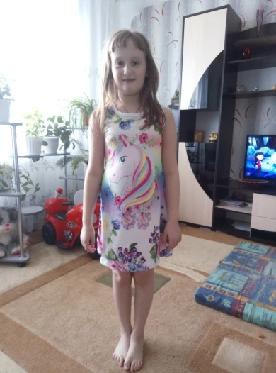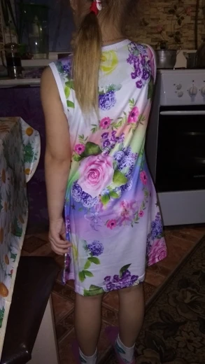 Pleasant body dress. But 100% polyester. rostovka 140. Granddaughter 5.5 height 118. Just below the knees.