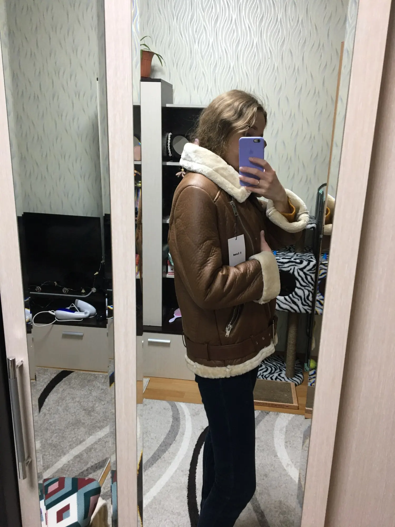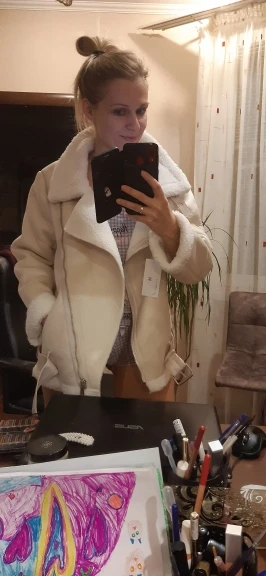 Two impressions of this jacket. At first, I did not like it in quality: a lot of sticking threads, fur climbing, uneven processing around the pockets and on the collar, thin enough material. But after looking at similar sheepskin coats in masmarket for 7000r, I realized that my with AliExpress for 2600r (bought with discounts and coupons is quite good). At its 42-44r height 168 cm took the size L, wanted an oversize, but she sat down like an ordinary jacket. But with a thick sweater is comfortable. While I wore once AT-6 and on the car, I did not freeze) it does not seem to blow, but provided that I came from home to the car and from the car the car In general, for the money that I bought, I’m satisfied.